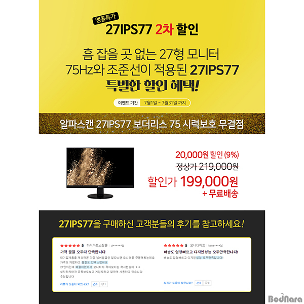 7월 1일부터 7월 31일까지 진행되는 이번 행사 기간 중에는 27IPS77제품을 정상가에서 무려 2만원 할인된 가격에 구매할 수 있으며, 추가적으로 무료배송의 혜택도 주어진다.