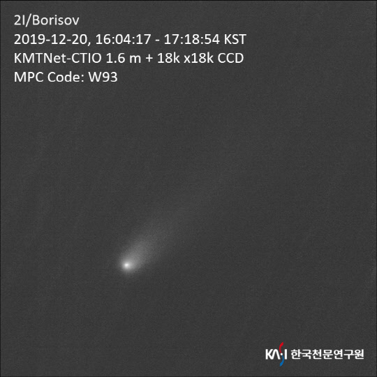 20일 한국천문연구원(이하 천문연)에 따르면 지난해 12월 20일 오후 4시 4분부터 5시 19분(한국시각)까지 1시간 15분 동안 ‘외계행성탐색시스템(KMTNet)’ 소속 칠레 관측소 망원경으로 ‘보리소프 혜성’을 촬영했다.
