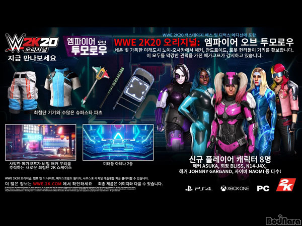 또한 4개의 새로운 디스토피아 스토리 타워와 8명의 미래형 WWE 슈퍼스타, 신규 아레나 2종, 캐릭터 파츠, 무기, 음성, 코멘터리 등이 추가된다.
