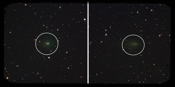 | 3월30일(왼쪽)과 4월17일(오른쪽) 아틀라스 헤성(C/2019 Y4)의 모습 (한국천문연구원 제공) 2020.04.29 / 뉴스1 |
