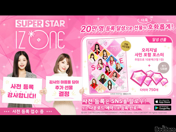 이로써 슈퍼스타 아이즈원은 사전예약 20만 참여자 돌파 시, 게임 내 사용할 수 있는 다이아 750개(총 합계 2,250개)를 추가로 제공하며, 추첨을 통해 맴버 전원의 친필 사인이 들어간 슈퍼스타 아이즈원 오리지널 포스터를 지급한다.
