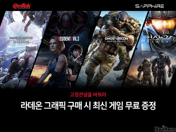 이엠텍아이엔씨(대표:이덕수, 이하 이엠텍)는 지난 2020년 2월 4일부터 진행한 AMD 아키텍처가 탑재된 이엠텍 사파이어 라데온 RX 5500 XT 구매 시 신작 게임 레지던트 이블 3, 헤일로 리치, 고스트리콘 브레이크포인트 3가지 게임을 모두 증정하고, RX 5600, RX 5700, 5700 XT 시리즈 구매 시 몬스터 헌터 월드 : 아이스본, 레지던트 이블 3, 헤일로 리치 3가지 게임을 증정하는 번들 프로모션을 5월 30일까지 연장 진행한다고 밝혔다.