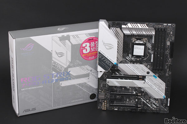일반 ROG 시리즈가 검은색과 붉은색의 조합을 통한 강력함과 화려함이 테마였다면, ROG STRIX Z490-A Gaming STCOM 메인보드(이하 STRIX Z490-A Gaming)는 검은색과 흰색의 조합으로 차분한 무게감을 테마로 잡은 제품이다.